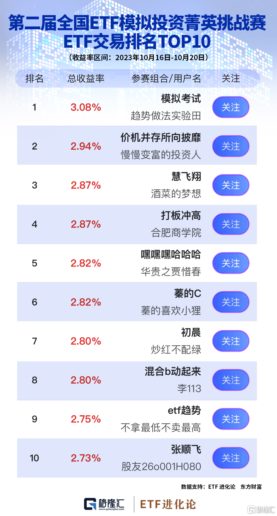 经过一周激烈的比赛,截至10月20日,第二届“全国ETF模拟投资菁英挑战赛”总榜TOP10: