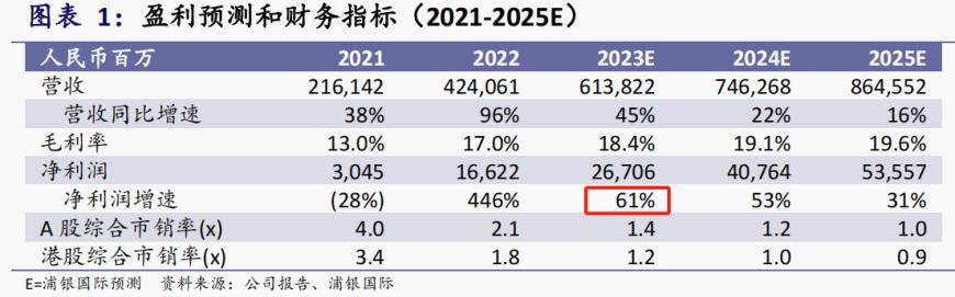 浦银国际证券沈岱等人在10月18日的研报中表示,比亚迪三季度业绩预告超出市场预期,公司3Q23新能源汽车销量达82.4万辆,创历史新高。借助持续扩大的规模优势和产业链成本控制能力,叠加电池等上游原料成本下行,比亚迪单车盈利同比、环比都继续提升,盈利能力持续向上增长。当前,中国新能源汽车市场稳定增长,整体趋势有望从三季度向四季度延续。所以,预计比亚迪单车盈利能力有望持续维持在三季度高位附近。展望明年,中国新能源汽车渗透率将维持加速上扬趋势,行业和公司的成长动能有望延续。比亚迪在中国新能源车市场份额有望从2022年的28%增长到2023年的35%,预计2023年净利润同比增长61%。