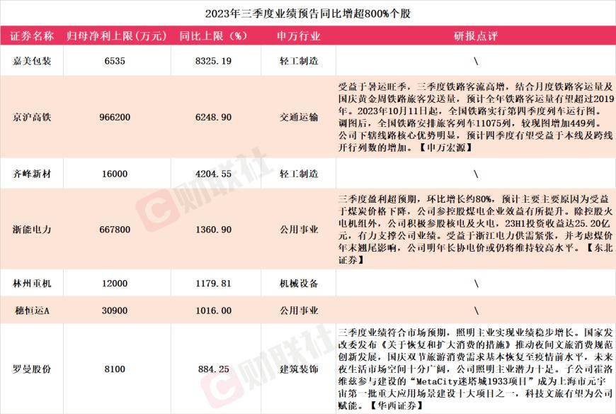 据财联社不完全统计,截至发稿,两市已有293家A股上市公司公布三季报业绩预告,其中7只个股预计净利同比增超800%,分别为嘉美包装、京沪高铁、齐峰新材、浙能电力、林州重机、穗恒运A和罗曼股份,具体情况如下图: