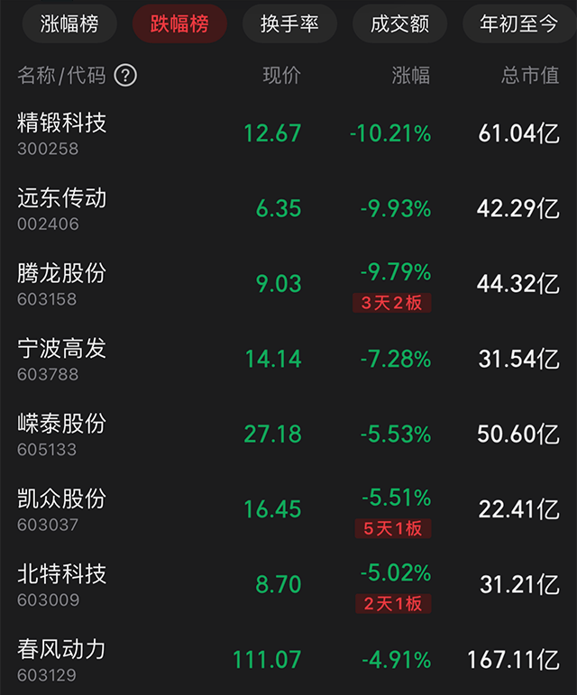 汽车板块中跌幅靠前的主要是前期被热炒的智能汽车零部件股,如精锻科技、远东传动、腾龙股份,分别下跌10.21%、9.93%和9.79%。此外,智能座舱龙头德赛西威下跌2.07%,是连续第9个交易日下跌。