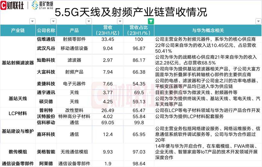 据财联社VIP盘中宝.数据栏目此前整理,在5.5G产业链中,今年上半年相关产品营收占比超50%的A股上市公司包括信维通信、武汉凡谷、灿勤科技、大富科技、麦捷科技、通宇通讯、硕贝德、普利特、沃特股份、信科移动、嘉环科技、美格智能和阿莱德,具体情况见表格如下: