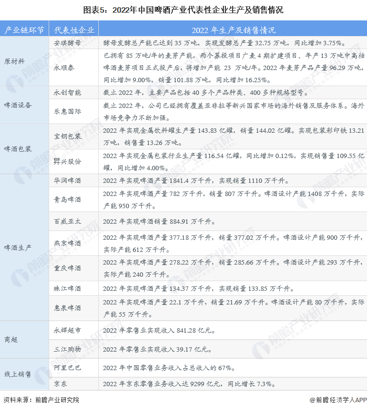 2022年,中国啤酒产业代表性企业产品的生产及销售情况汇总如下: