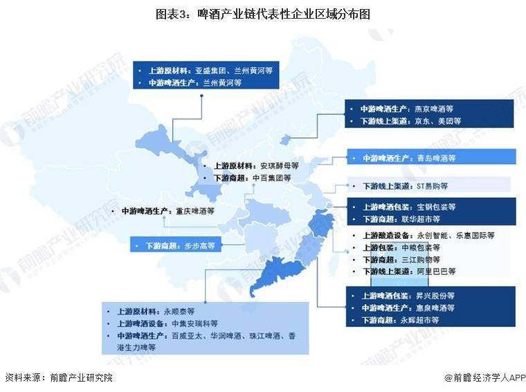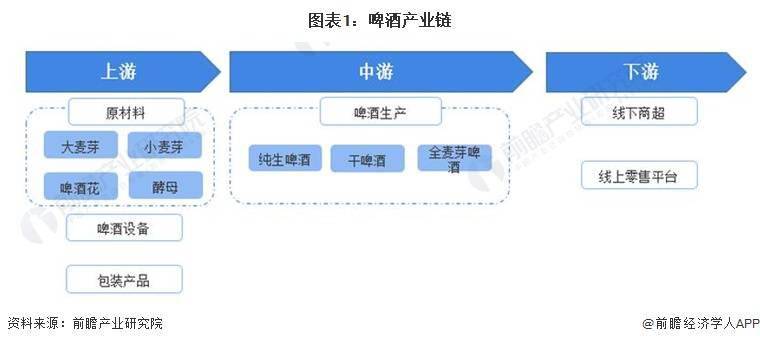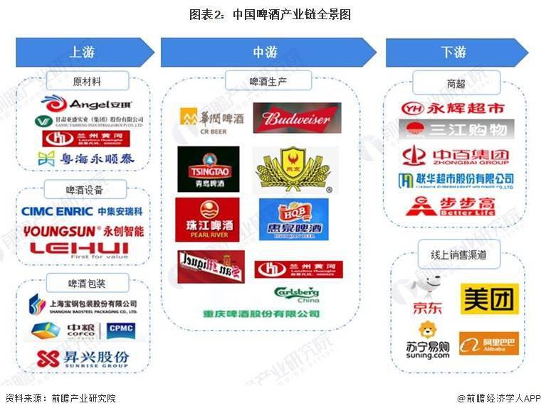 目前,我国啤酒行业上游原材料供应商主要为,永顺泰等;上游啤酒设备供应商主要为、等;上游啤酒包装主要有和等。中游啤酒主要生产商有华润啤酒、青岛啤酒以及百威亚太等。下游商超主要有、等;下游线上销售渠道主要有阿里巴巴、京东和等。