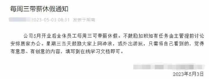 与其五天摸鱼,不如四天好好干。2023年4月,湖南长沙一传媒公司在其官方公众号发布消息称,全体员工每周三可带薪休假一天,鼓励公司员工每周三上网或外出游玩,且不提倡加班。这家公司的名字就叫“周三也休”文化传媒有限公司。