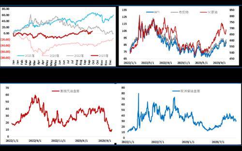 因巴以冲突的影响,投资者注意力都集中在了供应端的变化,事实上10月初油价暴跌之际,需求端的疲弱反应也值得关注。目前全球各地区汽油裂解差均处于低位,一直因供应紧张而表现抗跌的欧洲柴油裂解差近期也有走弱迹象,上周三大机构均不同程度对需求端预期有所下调,高油价对需求的抑制已经在9月有所体现,2024年需求增速下降将是大概率事件。短期内油价虽然因地缘因素冲高,但后续如果没有需求端配合,预计也很难维持在高位。一旦地缘风险降温,投资者注意力重新回到原油市场供需层面,油价预计难以保持当前的强势格局。