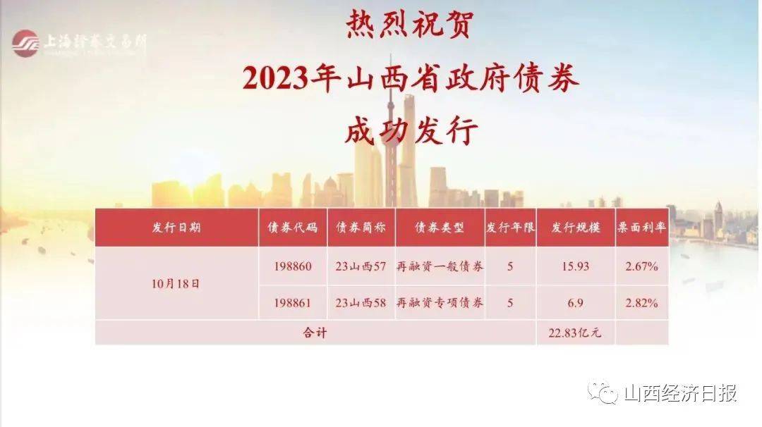 本批政府债券信用评级为AAA级,平均利率2.72%,平均投标倍数为23.67倍,全部为5年期再融资债券,依法严格纳入预算管理,债券资金用于偿还今年到期的山西省政府债券本金,在进一步降低融资成本的同时,有效均衡了全省未来年度存量政府债券到期规模,促进我省地方债发行长期健康发展。