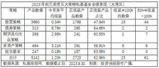 广东地区私募基金2023年前三季度成绩单发布!从投资快报股市广播主办的私募先锋榜榜单来看,截至9月底,广东地区私募基金前三季度平均收益率为1.20%,正收益占比52.96%。从广东地区不同策略收益表现来看,年内五大策略全部实现正收益,债券策略业绩继续领跑,多资产策略位居第二,股票策略整体表现欠佳。