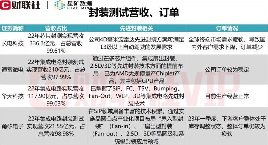 据财联社VIP盘中宝•数据栏目此前梳理,封测相关营收占比超九成的A股上市公司包括:长电科技、通富微电、华天科技和甬矽电子,具体情况见下图: