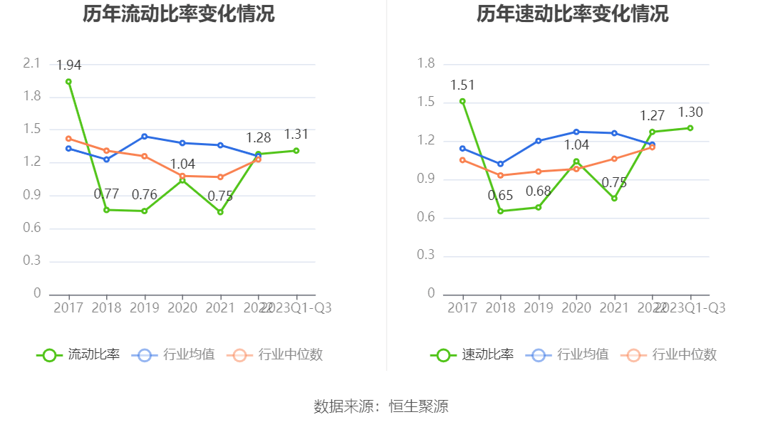 2023年前三季度,公司流动比率为1.31,速动比率为1.30。