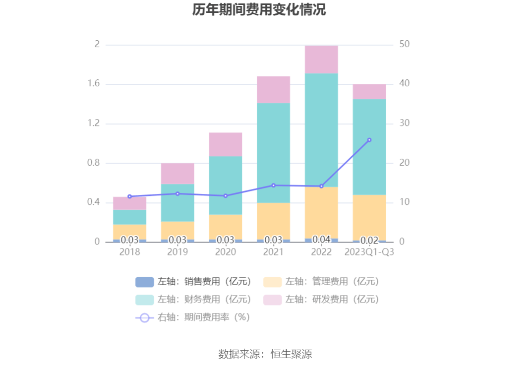 2023年前三季度,公司期间费用为1.59亿元,较上年同期增加1667.97万元;期间费用率为25.91%,较上年同期上升10.59个百分点。其中,销售费用同比下降30.26%,管理费用同比增长36.21%,研发费用同比下降29.74%,财务费用同比增长13.33%。