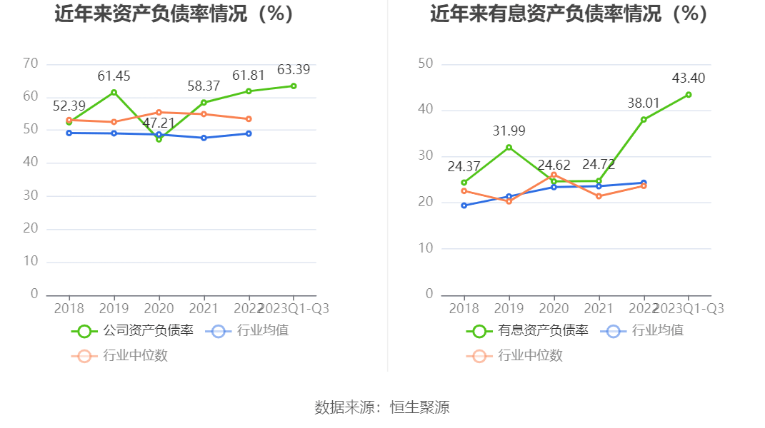 在偿债能力方面,公司2023年三季度末资产负债率为63.39%,相比上年末上升1.58个百分点;有息资产负债率为43.40%,相比上年末上升5.39个百分点。