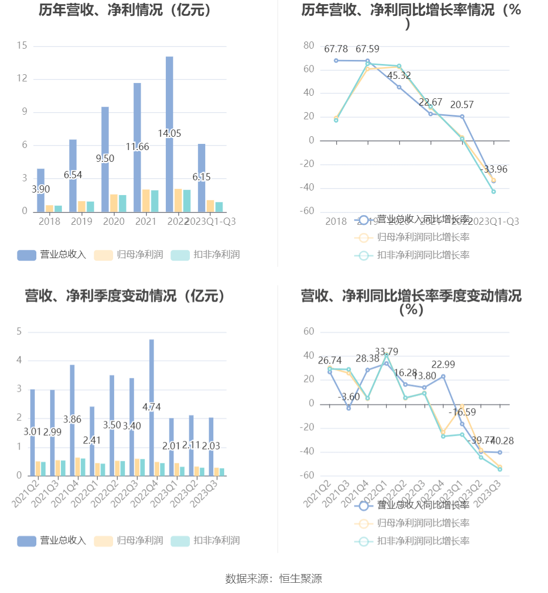 根据三季报,公司第三季度实现营业总收入2.03亿元,同比下降40.28%,环比下降3.61%;归母净利润2860.86万元,同比下降52.36%,环比下降12.42%;扣非净利润2671.08万元,同比下降54.46%,环比下降7.41%。