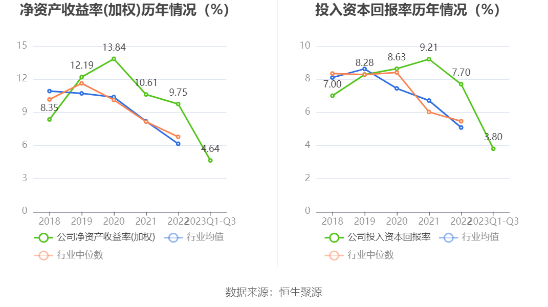 数据显示,2023年前三季度公司加权平均净资产收益率为4.64%,较上年同期下降3.04个百分点;公司2023年前三季度投入资本回报率为3.80%,较上年同期下降2.11个百分点。