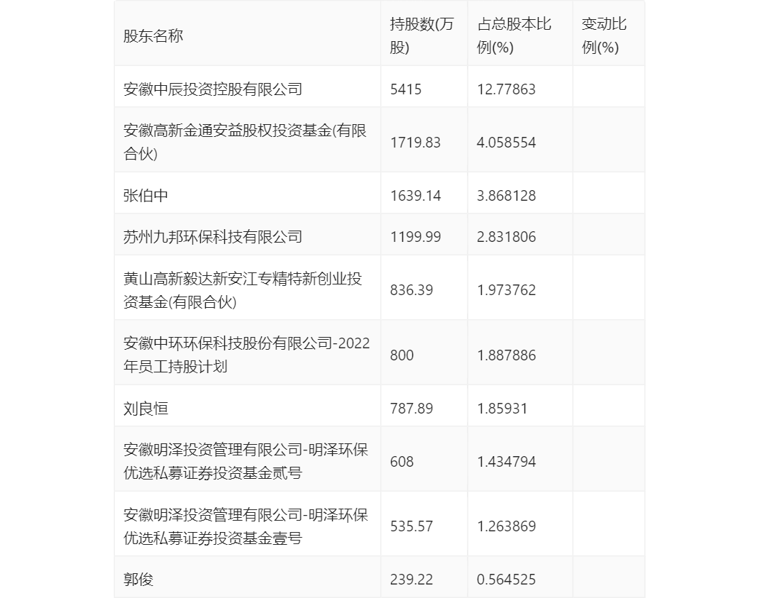 三季报显示,2023年三季度末公司十大流通股东中,持股最多的为安徽中辰投资控股有限公司,占比12.78%。十大流通股东名单相比2023年半年报维持不变。在具体持股比例上,安徽明泽投资管理有限公司-明泽环保优选私募证券投资基金壹号持股有所上升,安徽中辰投资控股有限公司、安徽高新金通安益股权投资基金(有限合伙)、张伯中、苏州九邦环保科技有限公司、黄山高新毅达新安江专精特新创业投资基金(有限合伙)、安徽中环环保科技股份有限公司-2022年员工持股计划、刘良恒、安徽明泽投资管理有限公司-明泽环保优选私募证券投资基金贰号、郭俊持股有所下降。