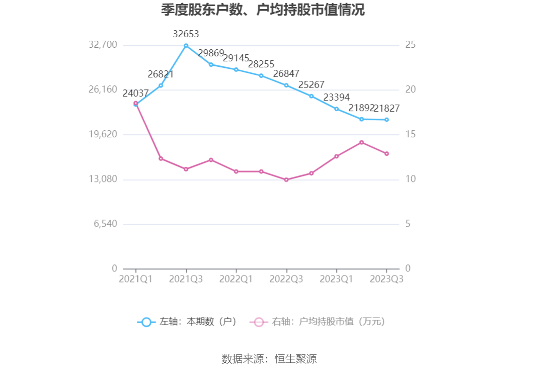 筹码集中度方面,截至2023年三季度末,公司股东总户数为2.18万户,较上半年末下降了65户,降幅0.30%;户均持股市值由上半年末的14.15万元下降至12.89万元,降幅为8.90%。