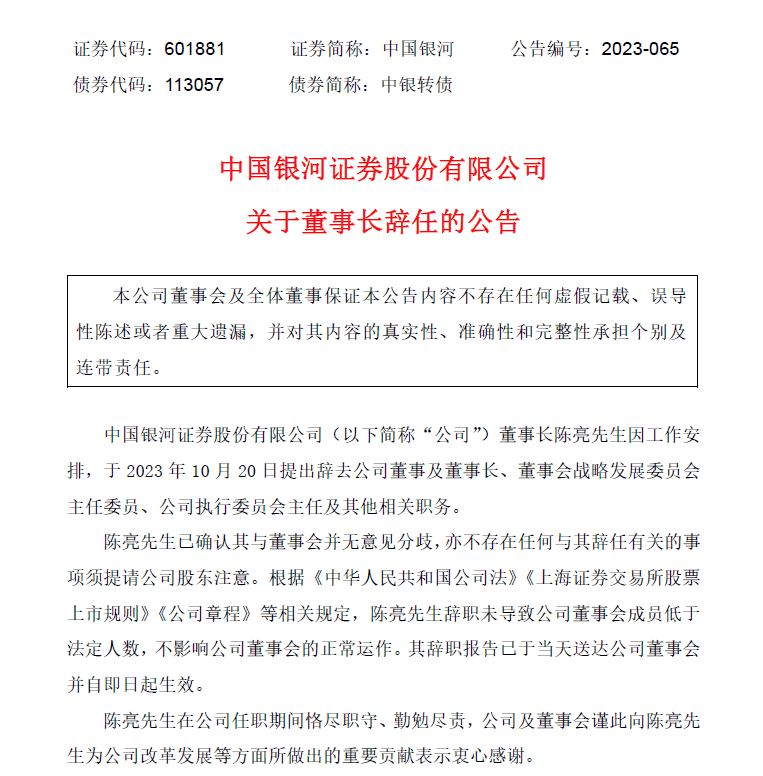同日,银河证券也公告,公司董事长陈亮因工作安排,于2023年10月20日提出辞去公司董事及董事长、董事会战略发展委员会主任委员、公司执行委员会主任及其他相关职务;由公司副董事长、执行董事、执行委员会副主任、总裁王晟代行董事长职责,并代行董事会秘书职责。公司将按照相关规定,尽快完成董事、董事长和董事会秘书的选聘工作。