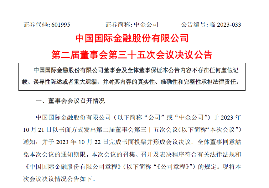 中金公司还称,由于年龄原因,黄朝晖提出辞去公司执行董事、董事会战略与ESG委员会成员、风险控制委员会成员、总裁(首席执行官)及管理委员会主席职务,董事会同意黄朝晖不再担任公司总裁(首席执行官)及管理委员会主席职务、聘任陈亮为公司管理委员会主席、吴波代为履行公司总裁(首席执行官)职责,直至公司聘任新任总裁(首席执行官)为止。