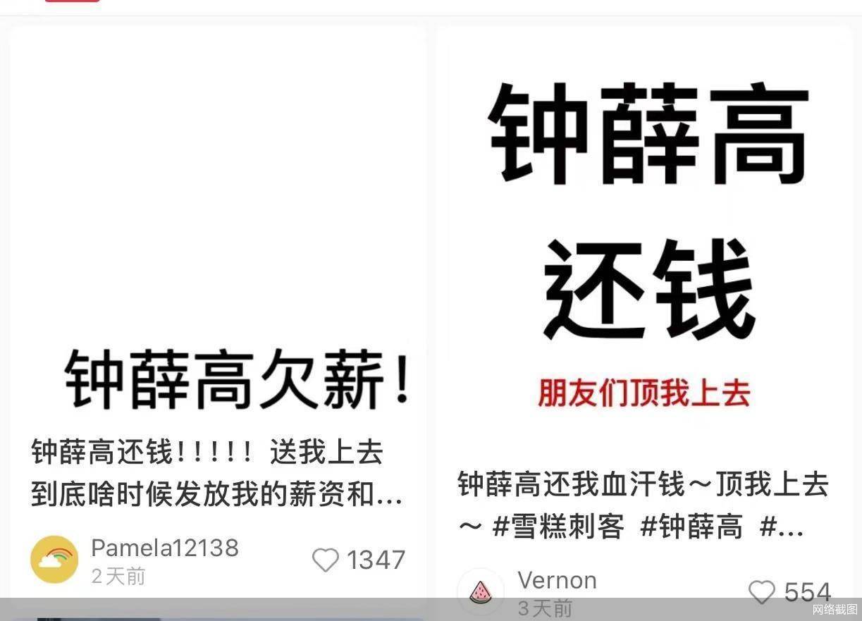 一石激起千层浪,大批网友在各种钟薛高官方账号下面打出“还钱”“发工资”等留言。