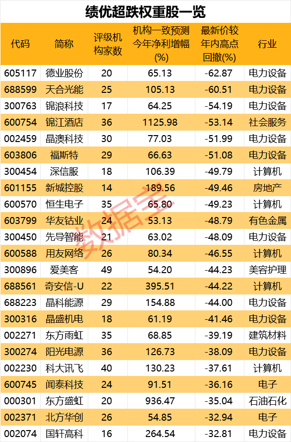 数据宝统计了自年内高点回撤超30%,且机构一致预测全年净利增幅50%以上的个股,共计23只。从行业看,年内电力设备指数自高点回调超过30%,因此也成为上榜个股数量最多的板块,共计10只个股;机构预计国轩高科、晶科能源、阳光电源和天合光能今年净利润有望翻倍增长。计算机板块则有5股入选,其中奇安信-U、科大讯飞和深信服机构一致预测净利增幅超100%。