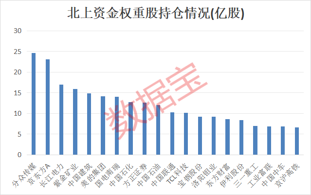 除去银行股,部分权重股的北上资金持股量居前。比如,分众传媒、京东方A北上资金最新持股量分别为24.65亿股、23.07亿股;长江电力、紫金矿业、中国建筑、美的集团等股北上资金持股量均保持在10亿股以上。