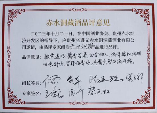经专家组成员激烈、严谨的商讨,由何勇向所有在场嘉宾展示并宣读:赤水洞藏酒微黄透明、酱香显著、曲香怡人。酒体醇和、协调,回味舒适,空杯留香好,具酱香型白酒风格。