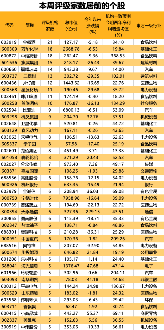 个股方面,43股获5家及以上机构给予“买入型”评级。上榜个股中,属于电力设备、汽车、食品饮料、医药生物行业的个股居多。其中金徽酒、万华化学、中炬高新获得18家及以上机构的关注。