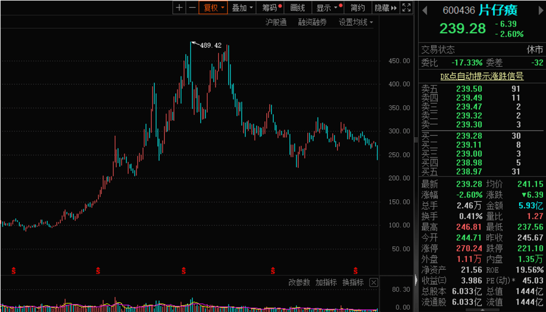 纵观来看,中欧医疗健康混合基金从2021年一季度末新进为片仔癀前十大流通股东,片仔癀股价在此期间波动较大,在2021年7月达到每股489.42元的历史高点,随后震荡回调,曾一度跌至每股221.53元,期间最大回撤超50%。