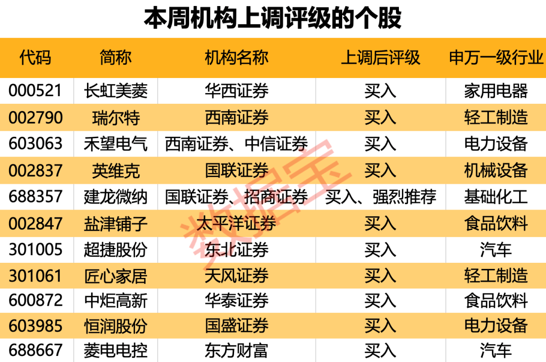 本周机构共上调11股的评级。英维克、建龙微纳获国联证券由“增持”上调至“买入”。西南证券将瑞尔特、禾望电气由“持有”上调至“买入”。同时评级获上调的还有盐津铺子、中炬高新等。