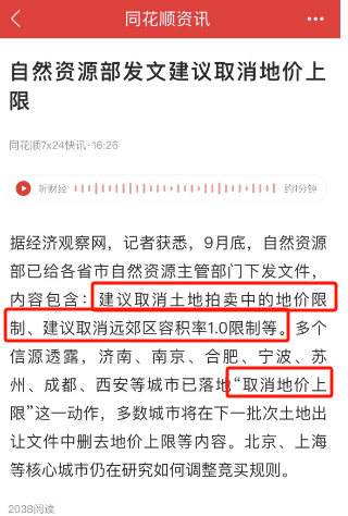 财联社10月17日电,9月底,自然资源部已给各省市自然资源主管部门下发文件,内容包含:建议取消土地拍卖中的地价限制、建议取消远郊区容积率1.0限制等。
