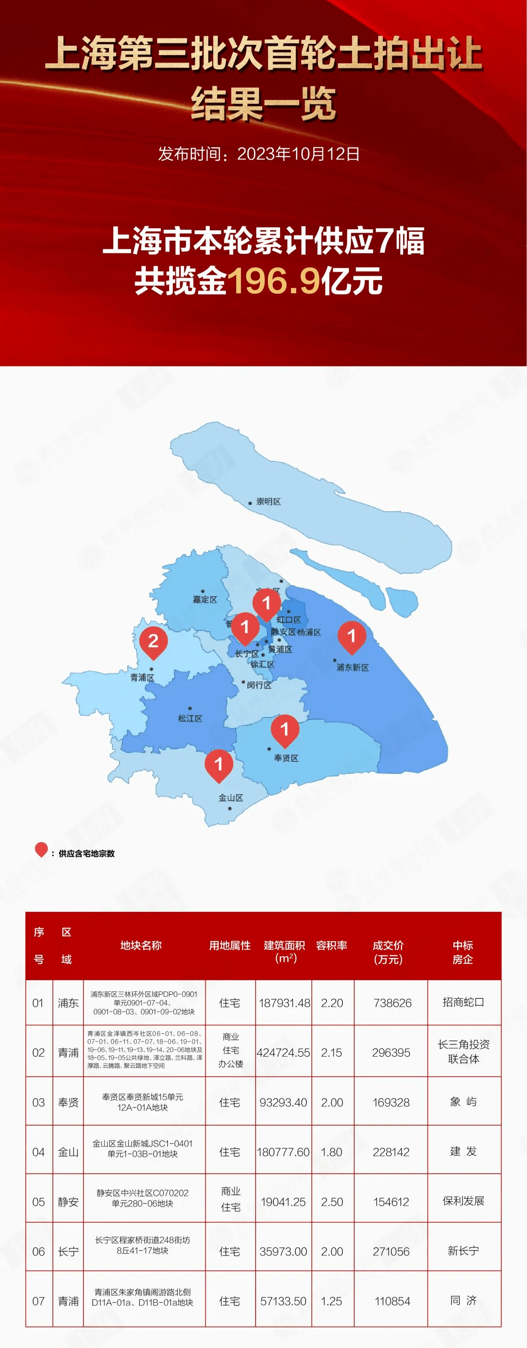 上海三批次土拍上半场7幅地块已完成出让,总成交金额196.91亿元,其中触顶价成交地块4幅,1幅轻微溢价,2幅底价成交。