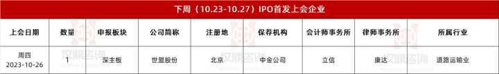 下周(10月23日-10月27日),IPO将审核1家深主板企业。