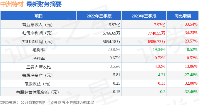 据证券之星公开数据整理,近期中洲特材(300963)发布2023年三季报。根据财报显示,本报告期中中洲特材营收净利润双双增长。截至本报告期末,公司营业总收入7.97亿元,同比上升33.54%,归母净利润7740.55万元,同比上升34.23%。按单季度数据看,第三季度营业总收入2.79亿元,同比上升19.5%,第三季度归母净利润2936.91万元,同比上升43.07%。