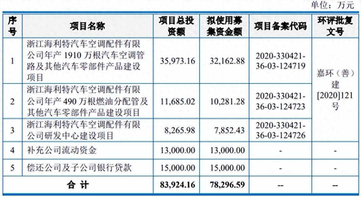 按照发行计划,上海汽配原募集资金7.82亿元,拟用于浙江海利特汽车空调配件有限公司年产1910万根汽车空调管路、年产490万根燃油分配管及其他汽车零部件产品建设项目、研发中心建设项目等。