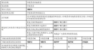 为满足广大投资者的投资需求,本公司决定于2023年10月23日(含)起取消中欧货币市场基金B类、D类份额非个人投资者在代销渠道单日单个基金账户的单笔或多笔大额累计申购、转换转入和定期定额投资业务金额的限制。