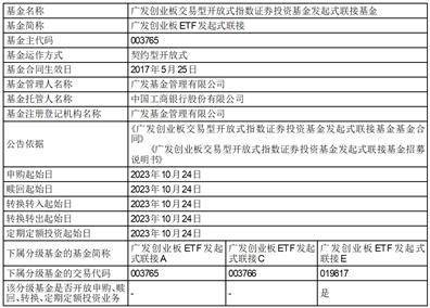 注:广发创业板交易型开放式指数证券投资基金发起式联接基金(以下简称“本基金”)自2023年10月24日起增设E类基金份额,并自2023年10月24日起开放本基金E类基金份额的申购、赎回、转换和定期定额投资业务。增设E类基金份额后,本基金包括A类基金份额、C类基金份额和E类基金份额。其中A 类基金份额、C类基金份额已开放日常申购、赎回、转换和定期定额投资业务,详见相关公告。