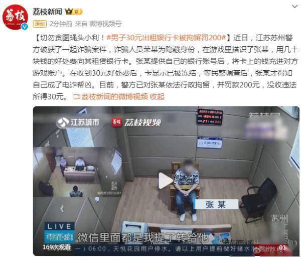 原标题:切勿贪图蝇头小利!男子30元出租银行卡被拘留罚200