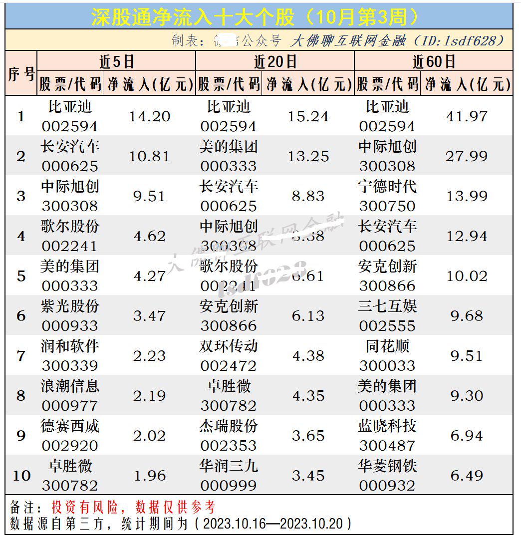 深股通资金近5日近20日和近60日资金流入/流出前十股票: