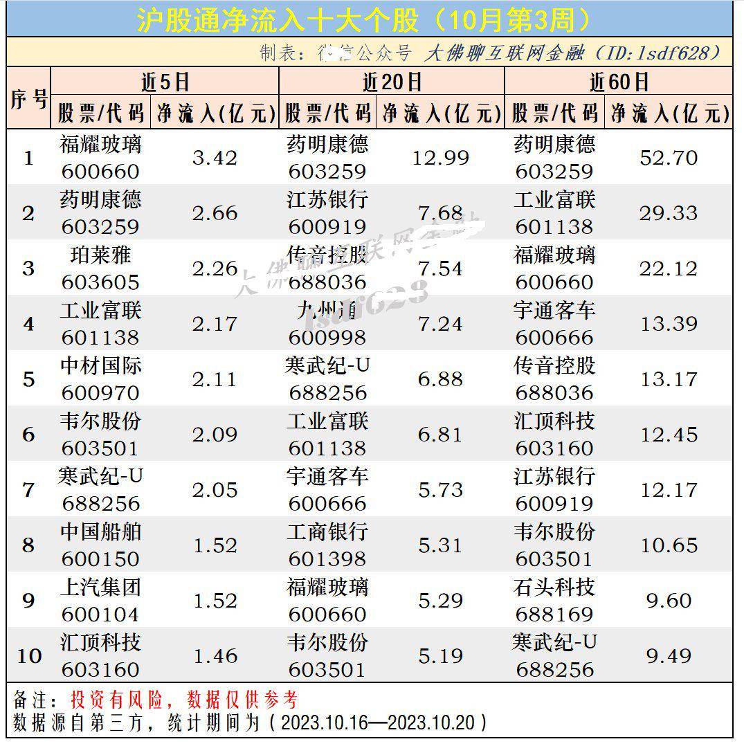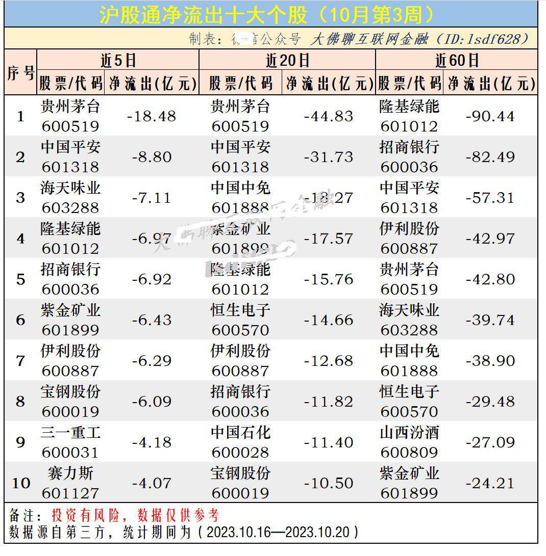 沪股通资金近5日近20日和近60日资金流入/流出前十股票: