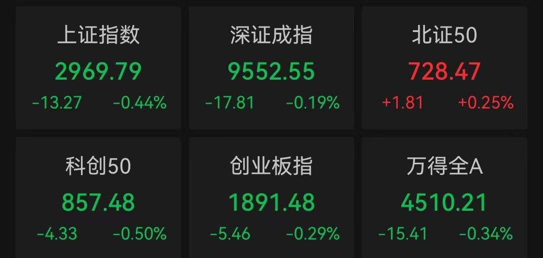 中新经纬10月23日电 23日早盘,A股三大指数小幅低开。上证指数跌0.44%,报2969.79点;深证成指跌0.19%,报9552.55点;创业板指跌0.29%,报1891.48点。