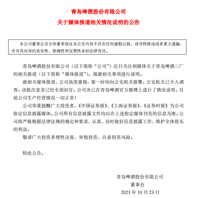 今日早间,青岛啤酒公告,近日关注到媒体关于青岛啤酒三厂的相关报道。就相关媒体报道,公司高度重视,第一时间向公安机关报警。公安机关已介入调查。该批次麦芽已经全部封存。公司并已在青岛啤酒官方微博上进行了情况说明。目前公司生产经营情况一切正常。