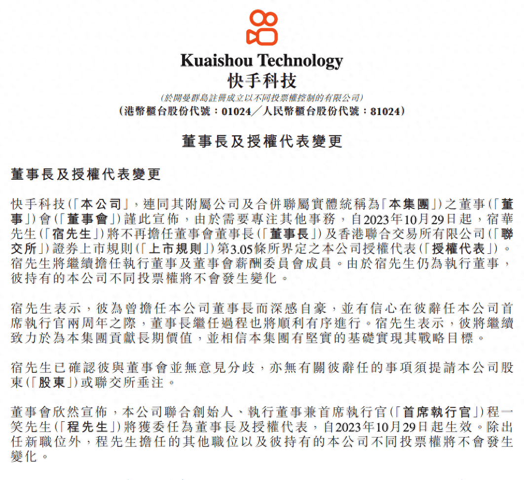 10月20日晚,快手科技发布公告称,宿华辞任董事长,由CEO程一笑兼任,该调整将于2023年10月29日生效。其辞任董事长后,宿华将继续担任执行董事和薪酬委员会成员,其不同投票权不会发生变化。