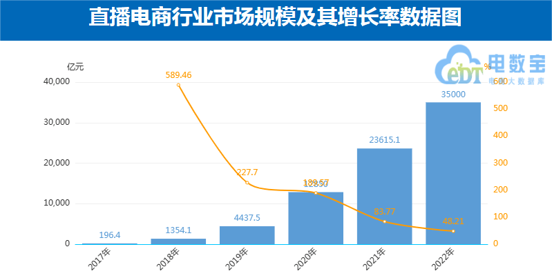 据网经社“电数宝”电商大数据库显示,2018-2021年,国内直播电商市场交易规模分别为:1354.1亿元、4437.5亿元、12850亿元、23615.1亿元。其中,2018年增长率高达589.46%,2019年-2020年增长率分别为227.7%、136.61%,增速下降。同时直播电商渗透率在2022年达25.3%,增长率为40.79%。增速降缓。