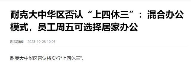 10月23日,据澎湃新闻报道:针对“耐克大中华区实行四天工作制”的消息,耐克大中华区相关负责人向澎湃新闻记者回应称,“我们一直以来,办公室员工执行的是每周5天工作制。新的混合工作模式是指办公室员工周一至周四需在办公室办公,周五可选择居家办公。”
