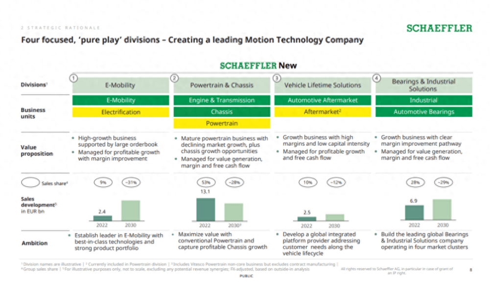 动力总成与底盘事业部。该部门将成为接纳舍弗勒和纬湃科技传统内燃机业务的部门。舍弗勒的内燃机和底盘业务以及纬湃科技的内燃机相关产品都将被囊括在这个部门中。2022年,这个部门在集团内的应收占比高达53%,但随着各大车企纷纷向电动化转型,预计其2030年在集团内的份额将下滑到28%。但不得不说,这个部门依然是新舍弗勒重要的业务支柱之一。