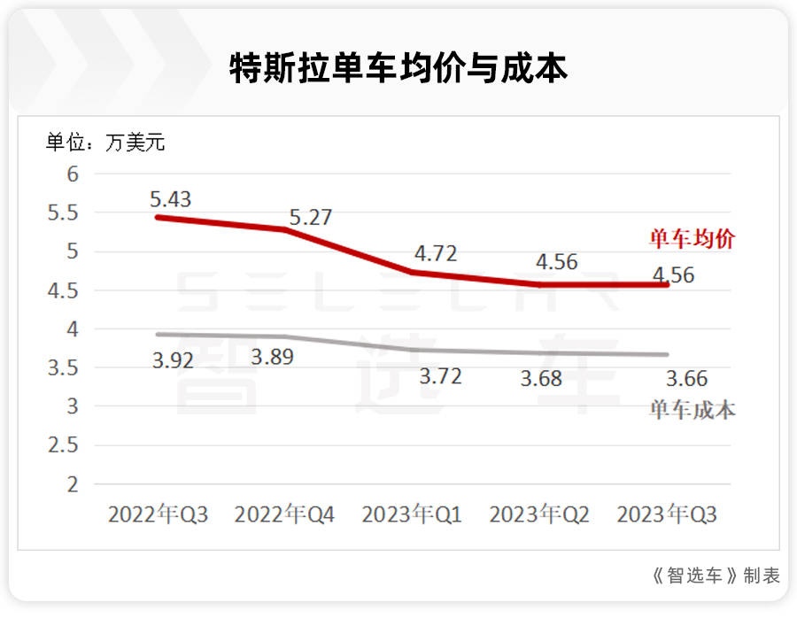 造成这一现象的原因是特斯拉在全球范围降价。从数据来看,今年第三季度特斯拉的单车均价为近年新低,与去年同期相比下滑近1万美元,但是成本的降幅远低于单车均价。