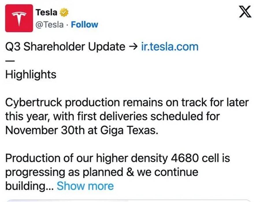 首先便是特斯拉Cybertruck的交付。特斯拉于10月19日早上确认,电动皮卡Cybertruck将在11月30日开启交付,而这款车或将扭转公司的财务颓势。