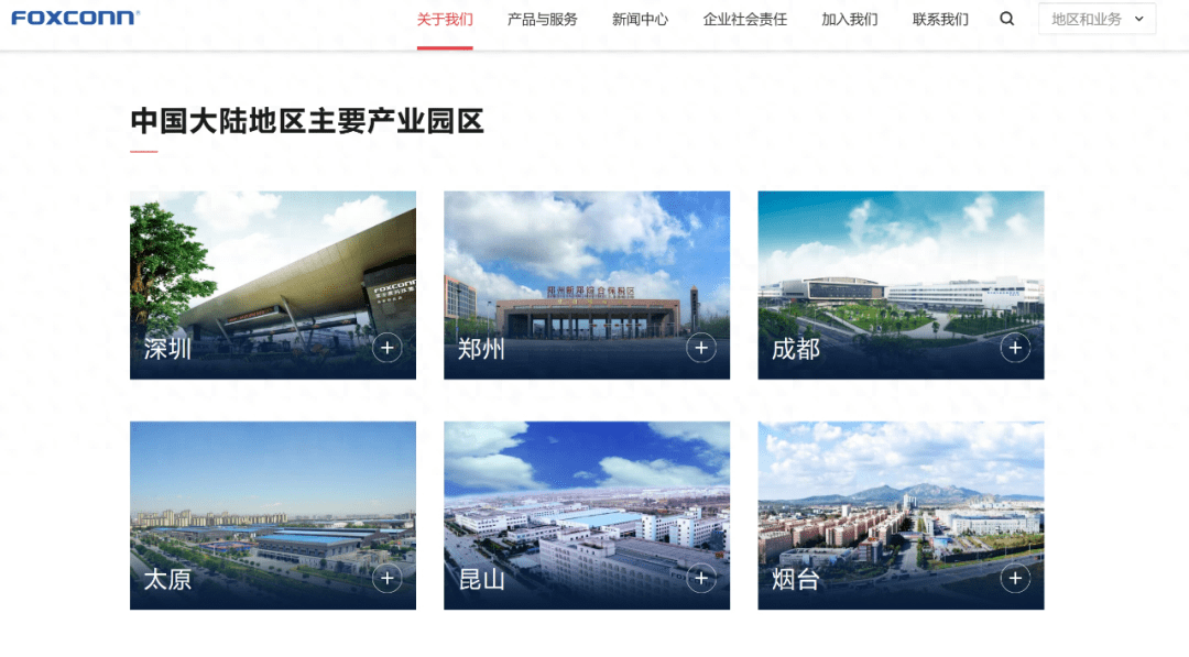据富士康官网资料显示,富士康于1988年投资中国内地,目前在内地拥有40余个园区,高峰期拥有百万员工,集团在中国内地的主要产业园区分布在深圳、郑州、成都、太原、昆山、烟台,产品范围涵盖消费性电子产品、云端网络产品、电脑终端产品、元器件及其他四大领域,是全球最大的电子科技智造服务商。