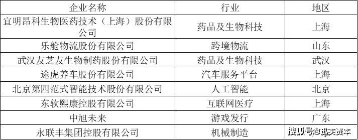 分别为:宜明昂科生物医药技术(上海)股份有限公司,是一家生物技术公司;乐舱物流股份有限公司,是一家跨境海运物流服务提供商;武汉友芝友生物制药股份有限公司,是一家生物技术公司;途虎养车股份有限公司,是一家汽车服务平台;北京第四范式智能技术股份有限公司,是一家人工智能软件公司;东软熙康控股有限公司,是一家云医院平台公司;中旭未来,是一家网络游戏产品发行商;永联丰集团控股有限公司,是一家回转支承制造商。