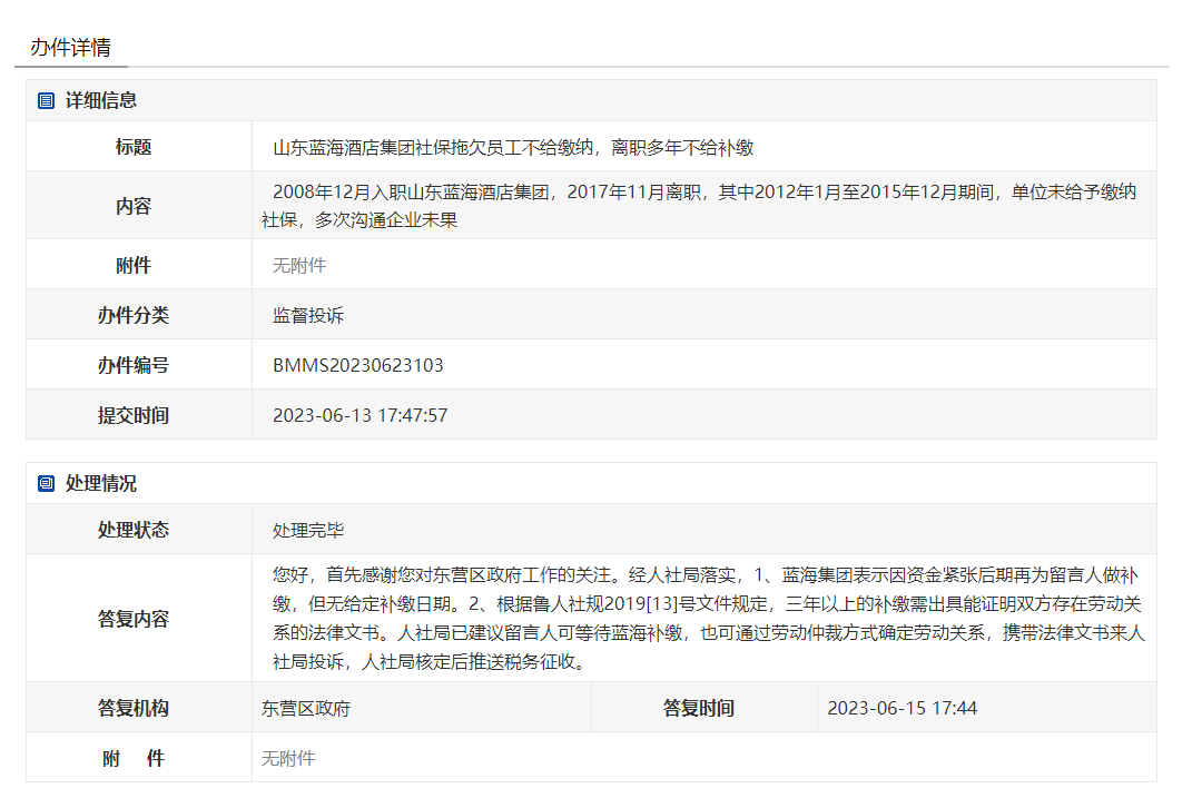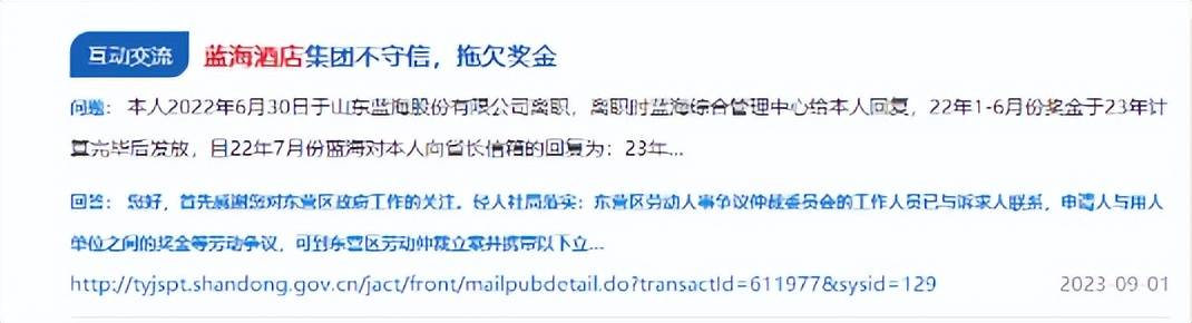 关于蓝海酒店集团工资拖欠的问题,很早就出现在东营市人民政府官网的“政民互动”中。这一次,当地选择正面回应。
