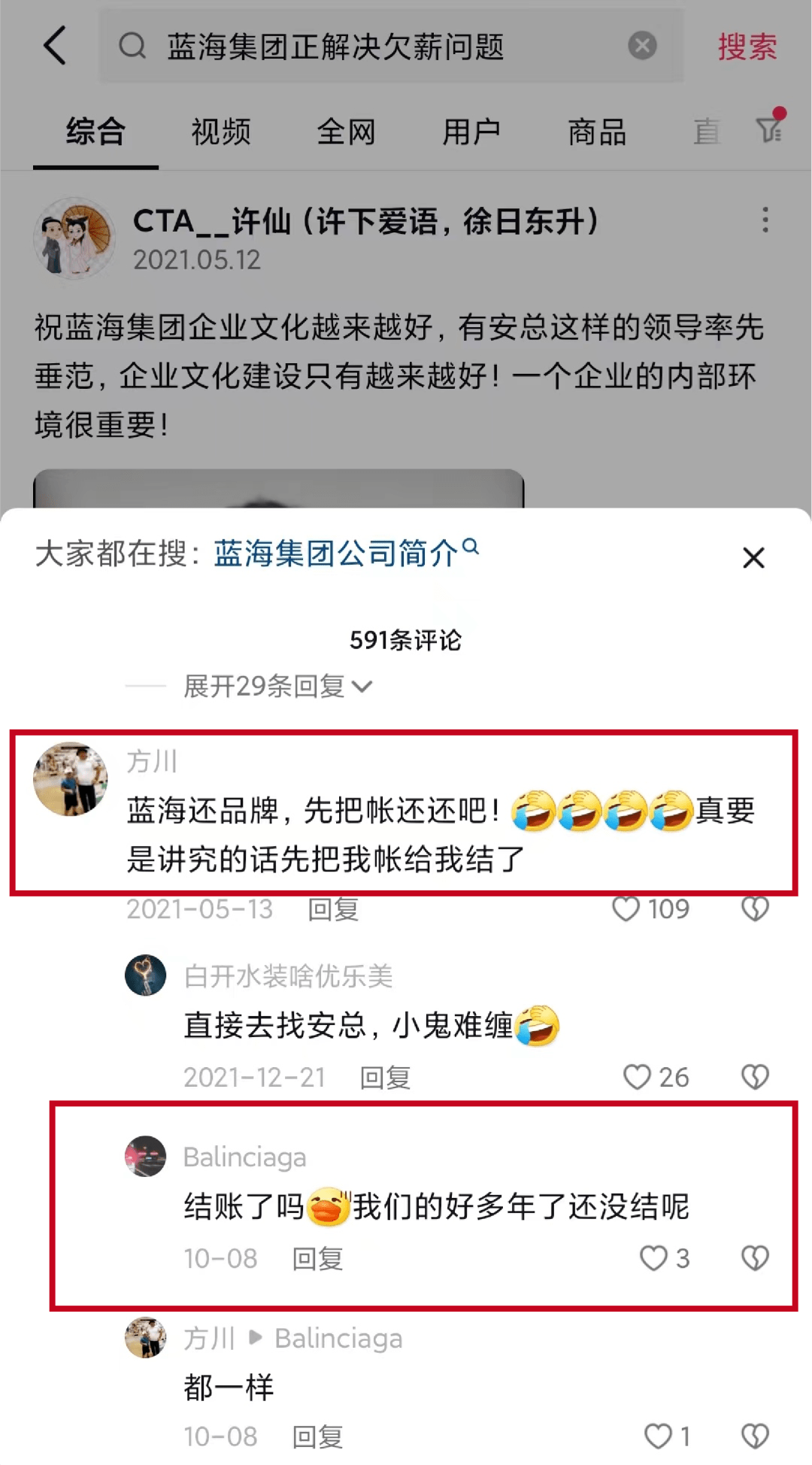 而在抖音平台,在与蓝海集团的相关视频下,还被爆出拖欠供应商货款。